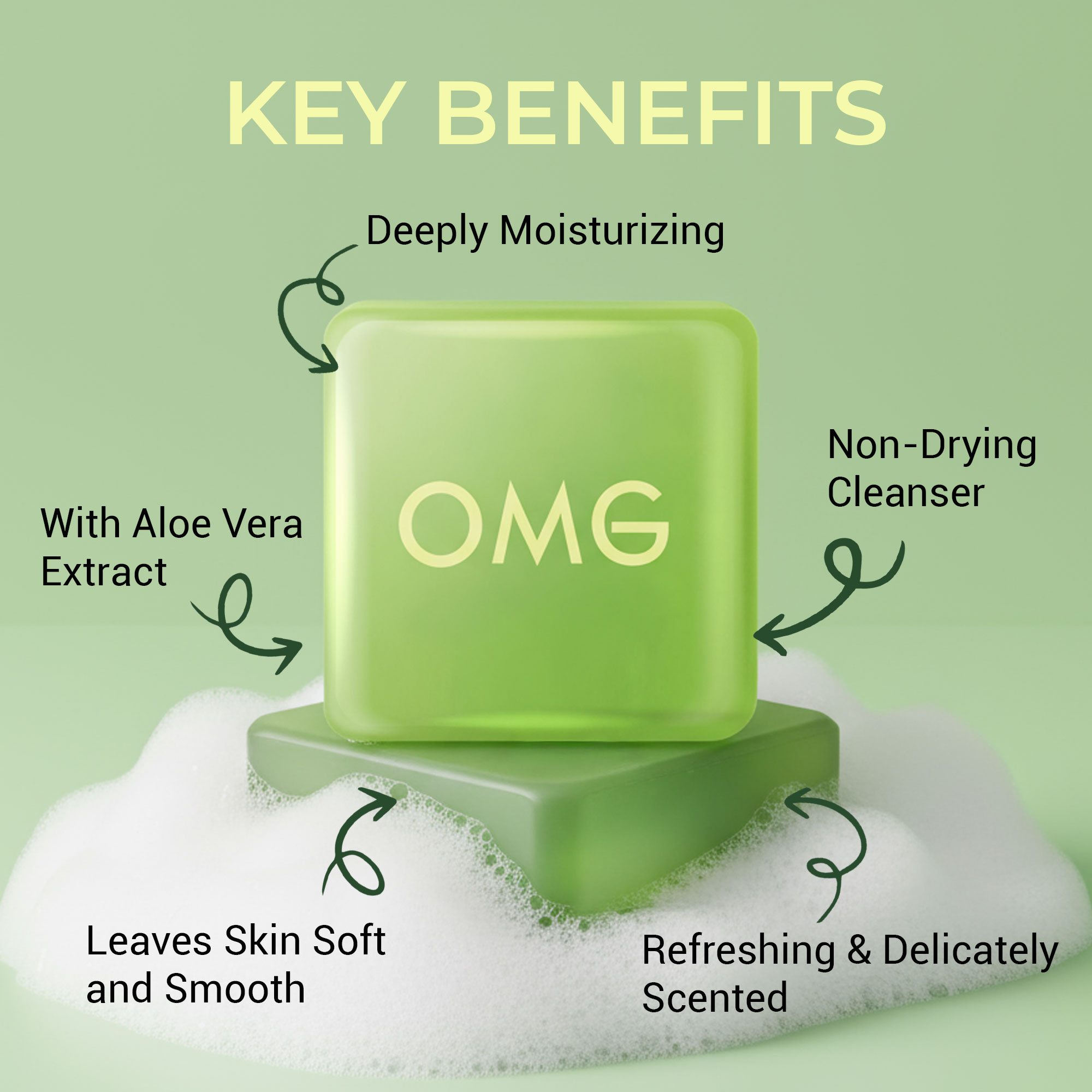 OMG Aloe Vera Facial Soap gently cleanses dirt and excess oil while keeping skin moisturized and refreshed. Enriched with Aloe Vera, Glycerin, and Sorbitol, it leaves skin soft, smooth, and comfortable after every wash. Suitable for daily use on dry to normal skin.